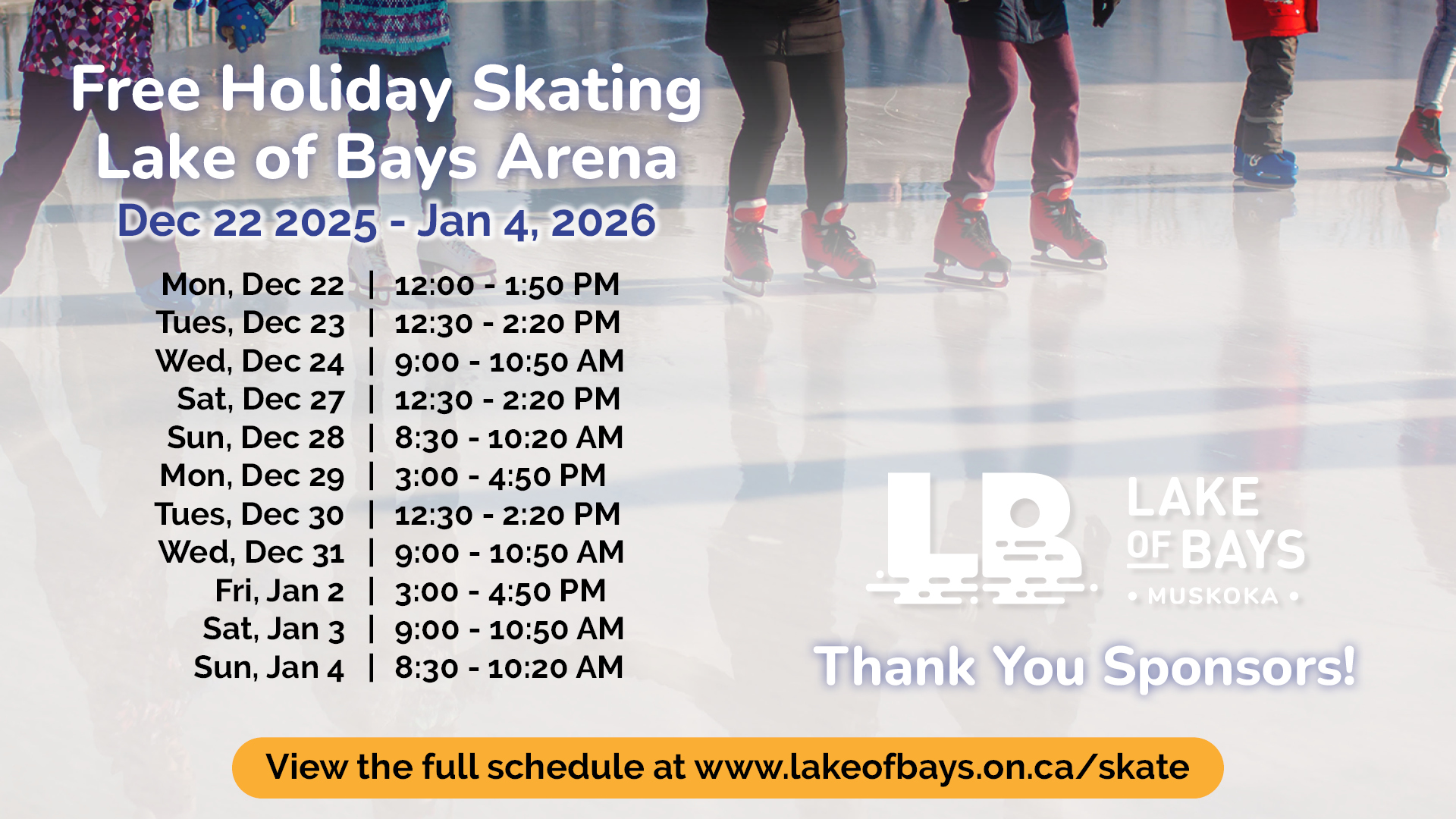 All sessions are free of charge, open to all ages, and take place at the Lake of Bays Arena, 10 University Street in Baysville. View the full schedule at lakeofbays.on.ca/skate.
