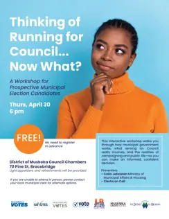 Residents interested in learning more about serving on Council are invited to attend a regional Candidate Information Session on Thursday, April 30, 2026, at the District of Muskoka Council Chambers in Bracebridge.